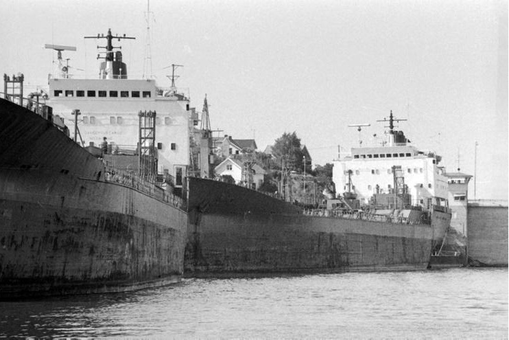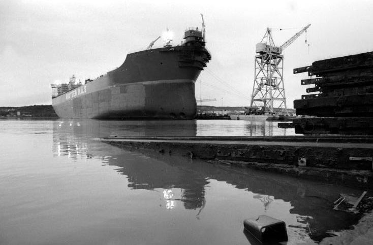 Fredrikstad Mekaniske Verksted/FMV er en av byens aller mest kjente arbeidsplasser. Selskapet ble etablert helt tilbake i 1870, og i perioden frem til 1987 ble det produsert hele 443 båter og fartøyer her. På bildet fra 1986 (to år før nedleggelsen av verftet), ser vi en 257 meter lang og 46 meter bred shutteltanker på 117.400 dødvekttonn. Industriområdet bedriften disponerte utgjør i dag en helt ny bydel i Fredrikstad som går under betegnelsen Værste.