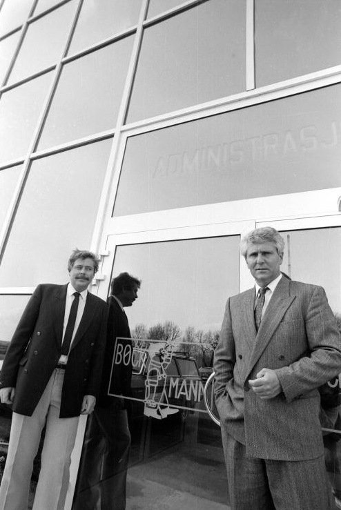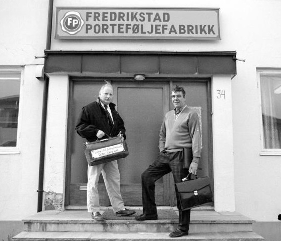 Fredrikstad porteføljefabrikk produserte blant annet vesker av mange slag. Bildet viser disponent Thor-Erik Bjørnstad og designer/verksmester Odd Jansen som i 1989 kunne melde om god salgsutvikling blant annet takket være en ordre på 20.000 vesker til SAS. Selskapet hadde produksjon i Hassingveien, og eget utsalg i gågaten.