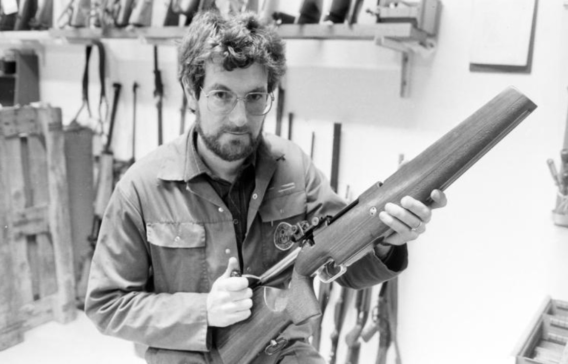 EVT – Eriks Våpen Teknikk holdt til på Ålekilene på Gressvik, og de utviklet flere typer våpen, blant annet til konkurranse-bruk. På bildet ser vi Børsemakermester Erik Solbakke som viser frem et nytt gevær i 1985. Holstad våpen kjøpte opp bedriften i 2016, og flyttet produksjonen ut fra Fredrikstad.