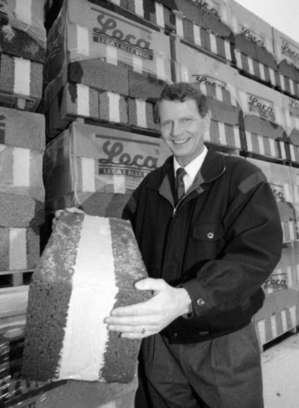 Leca, eller AS Norsk Leca som var det opprinnelige navnet, ble etablert i 1954. Selskapet mener selv at de ved lanseringen av Leca blokken bidro til å få byggekostnadene så langt ned at en vanlig familie med normal inntekt kunne skaffe seg sin egen bolig. Leca lages av leire som er brent og omdannet til små porøse kuler. Leca er en forkortelse for Light Expanded Clay Aggregate. Selskapet er i dag eiet av det franske industrikonsernet Saint-Gobain, og inngår i samme forretningsområde som Glava og Gyproc. På bildet ser vi direktør Kjartan Wehn som i 1990 viser frem en Leca-blokk.