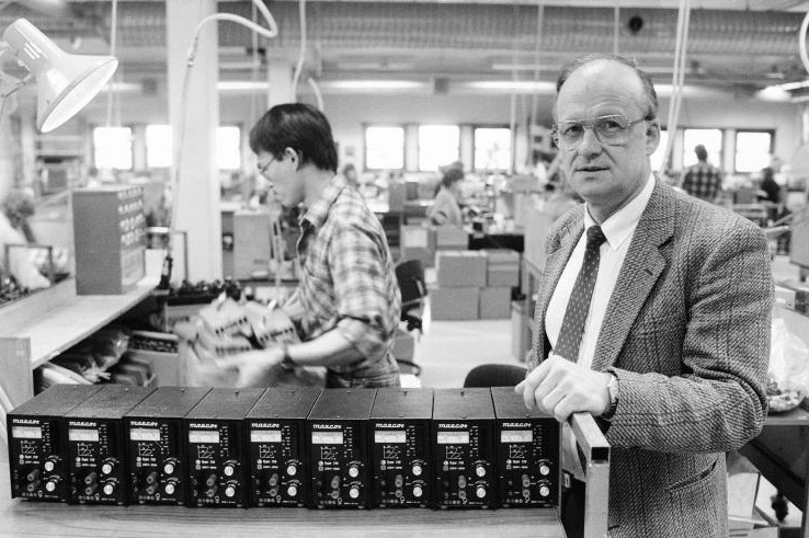Mascot electronics ble etablert under navnet Østfold Radio i 1938, og var en av radiopionerene i landet. I 1964 startet man opp produksjonen av strømforsynere/-ladere. Bildet viser administrerende direktør Jan Kristiansen som i 1989 meldte at året før hadde vært et rekordår for bedriften. Selskapet er fortsatt i familien Kristiansens eie.