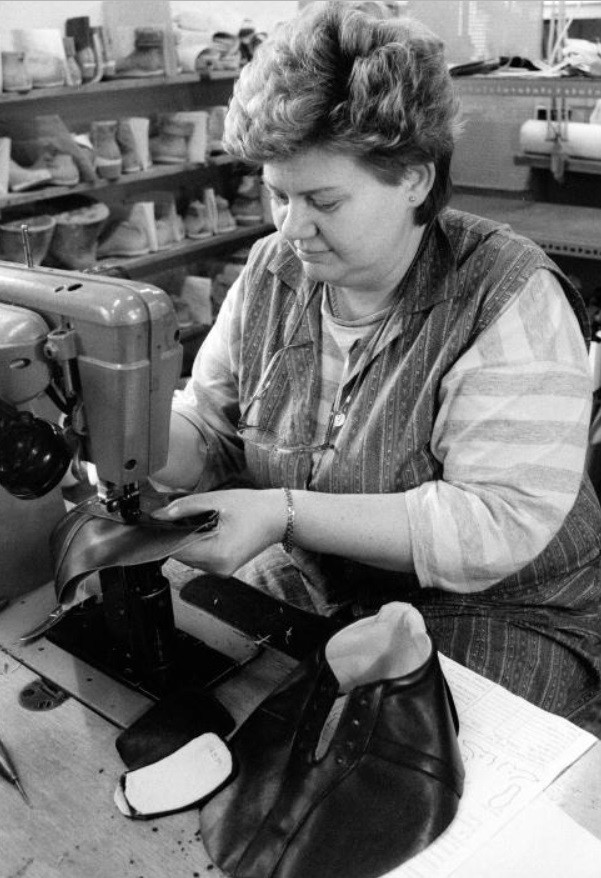 Sun-Chris (tidligere Norsk Sko) startet sin produksjon allerede i 1938, og spesialiserte seg den gangen på barnesko. Senere så de et større marked i spesialsko, og var landets største verksted for ortopedisk fottøy i mange år. Bildet til venstre viser nåtlerske Astrid Nilsen i 1987.