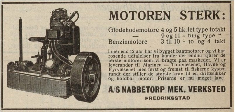 Nabbetorp mekaniske verksted ble opprettet i 1896, og i begynnelse leverte verkstedet maskiner til teglverk og sagbruk. Allerede i 1906 la de om fra dampdrift til elektrisitet som kraftkilde, og var med det en innovatør på dette området. I 1909 startet produksjonen av motorer, og med det ble de en betydelig leverandør til FMV. Kilde: Wikipedia
