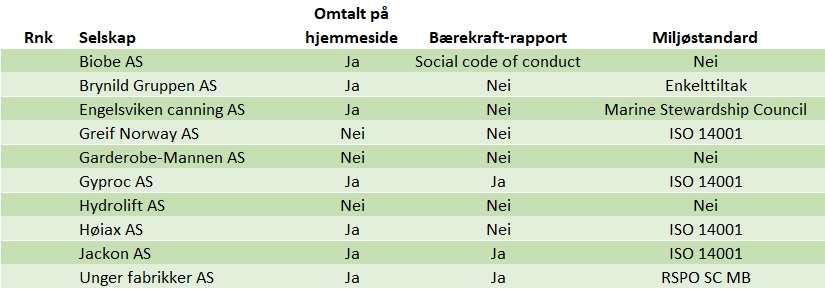 Overskriften og innledningen trigget min interesse, og jeg tenkte at jeg måtte starte med å avdekke hvordan status er blant de større bedriftene i Norge. Min tanke var at jeg kunne “lese” noe om hvordan selskapene så på dette med bærekraft gjennom å se om det var omtalt på selskapenes hjemmeside, om de hadde egne rapporter på det, og ikke minst om de fulgte en miljøstandard. Jeg valgte å ta utgangspunkt i Dagens Næringslivs liste over Norges 500 største bedrifter (2017), og bestemte meg for å sjekke status på bedriftene som lå på hhv plass 150 til 159 og 250 til 259. Jeg visste ikke på forhånd hvilke bedrifter det var, men kom frem til følgende funn: