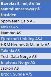 Det må understrekes at jeg ikke har brukt veldig lang tid pr. hjemmeside, så det kan være at jeg har oversett noe. Hvorvidt styrene i disse selskapene virkelig har engasjert seg i muligheter og utfordringer relatert til bærekraft vites ikke, men min hypotese er at dess mer synlig dette er på hjemmesidene, dess mer sannsynlig er det at de har engasjert seg. Jeg sjekket derfor sidene på nytt for å se hvilke selskaper som har bærekraft, miljø eller samfunnsansvar nevnt på sin startside.