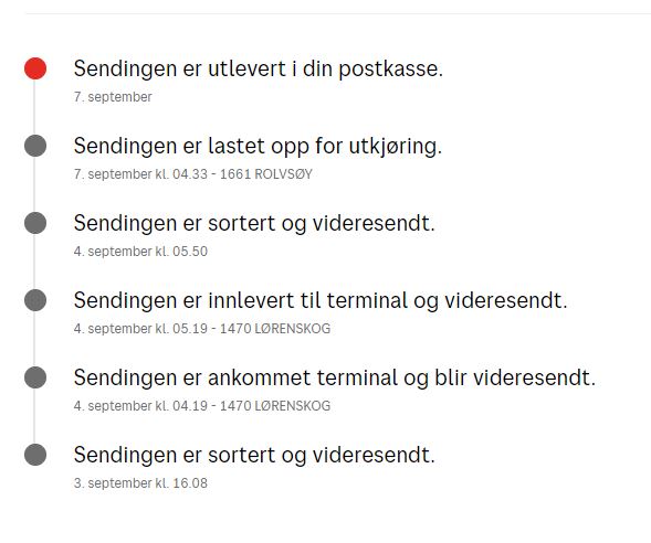Denne pakken ble sendt fra Oslo den 23. september klokken 15:48, og ankom mitt hentested på Gressvik den 24. september klokken 14:40. Med andre ord tok den kun ett døgn. Når det er sagt så er dette ikke helt sammenlignbart med leveranser som skal gjøres helt frem til mottager.