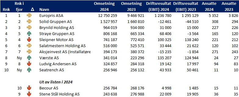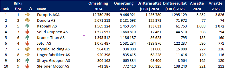 Det er i år en del endringer på listen, og det er verdt å legge merke til at Kappahl tar to steg opp, og er nå de tredje største selskapet på listen. De skyver Solid Gruppen en plass ned. Kronos Titan tar ett steg opp, og her er det verdt å huske på at de har fritak for å utarbeide konsernregnskap, så tallene her er for selskapet i Fredrikstad isolert. Jøtul faller hele to plasser, og resultatutviklingen er ikke god. Straye Gruppen og Sleipner bytter plass på årets liste.