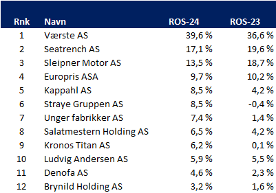 Resultat eller fortjeneste er et begrep som må defineres. Nå blir det selvfølgelig relativt uinteressant å definere dette i form av resultat i kroner, da driftsresultatet for en bedrift med nesten 13 milliarder i omsetning naturlig nok vil være anderledes enn en bedrift med trehundre millioner. Selskapene på listen er selvfølgelig også i helt forskjellige bransjer og i forskjellige deler av sin verdikjede (produsenter, foredling, handel, utvikling). Det best sammenlignbare blir derfor å se på det relative driftsresultatet målt i form av resultat før finans og skatt dividert på total omsetning (normalt omtalt som return-on-sales eller bare ROS). Årsaken til at vi måler etter avskrivninger er at vi da får sammenlignbarhet mellom selskaper som benytter leasing og de som benytter egenkapitalfinansiering når det gjelder investeringer. Ved å benytte resultat før finans så eliminerer vi også forskjellen i finansieringsform (noen selskaper er finansiert med høy grad av egenkapital og andre med høy grad av fremmedkapital). Vi sammenligner dermed relativt like driftsresultat.