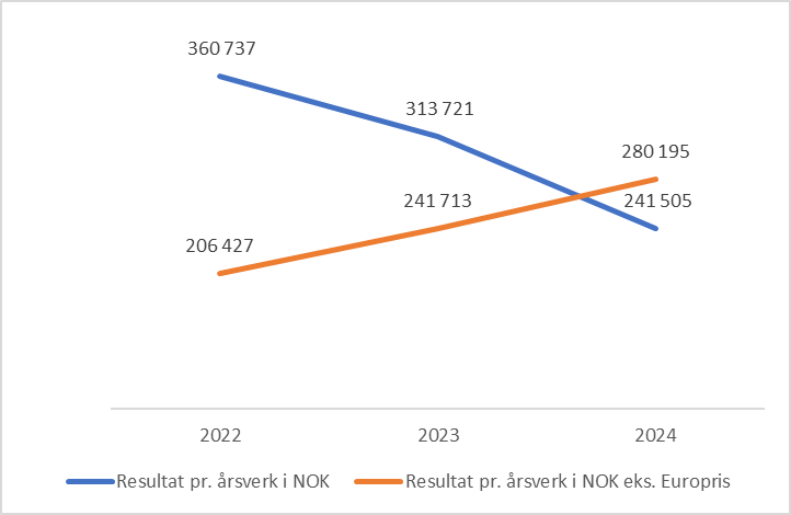 I fjor rapporterte jeg utvikling i driftsresultat pr. ansatt. Og da viste dette en unormal sterkt nedgang grunnet økning i ansatte samtidig som resultatene falt. I år fortsetter trenden om vi tar med Europris i tallene, da de øker antall ansatte med hele 1.526, og resultatet går ned. Korrigert for dette selskapet så ser vi en økning i resultat pr. ansatt (årsverk):